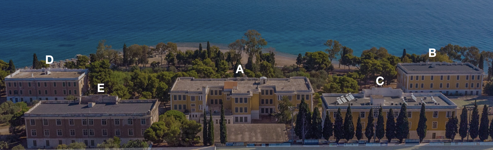 The AKSS seafront complex comprises five buildings labelled A, B, C, D and E. Building A contains: on the ground floor, the School's lecture theatres, an indoor self-service cafeteria, and a coffee shop with outside tables (the Magus Art Café); on the first floor the offices of the AKSS's administration. Building C will accommodate the School's participants. The registration fees include accommodation at the AKSS, breakfast and two dinners.